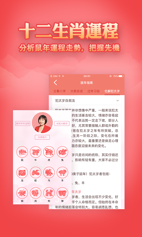 【麥玲玲2020鼠年生肖運程】APP大中華地區正版授權,內容與《麥玲玲2020鼠年生肖運程》書籍同步,根據周易五行生克及飛星吉凶的情況,除了給大家講解每個生肖在2020年的財運、事業、身體、感情等運勢外,還附上世界大勢總論,犯太歲化解錦囊,過年習俗知識,每日通神等精彩內容,而最吸引眼球的是"鼠年行好運風水佈局”,結合2020年九宮飛星風水佈局來調整每個屬相的運氣,想旺丁旺財旺事業,得金得銀得姻緣的你又怎麼能錯過?
