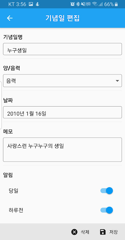 觸摸[週年紀念日]或[註釋]按鈕分別顯示週年紀念日和備忘錄註冊屏幕。
