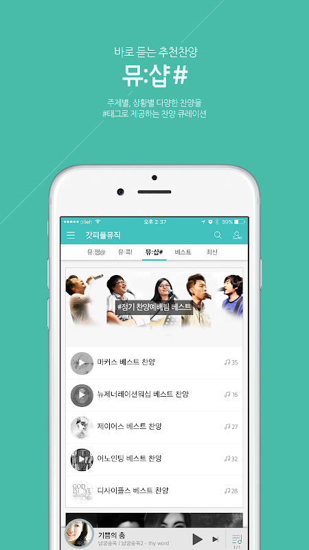 찬양을 들을 수 있는 큐레이션이 강한 뮤직 어플입니다.