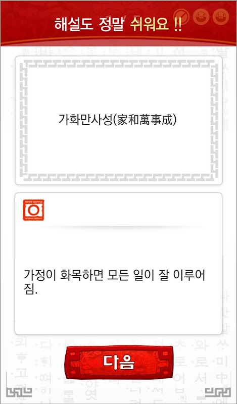 고사성어 해설을 통해 한자의 음과 뜻을 찾아 맞추는 게임입니다.