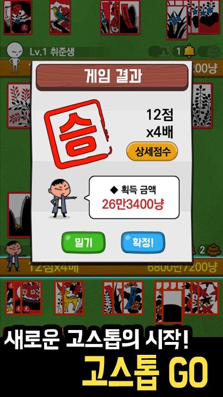 1대1 맞고에서 이기면 레벨상승! 신분상승!