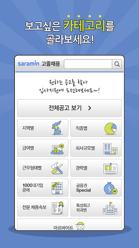 - 1000대기업 공채부터 전문 채용속보까지! 카테고리별 다양한 공고를 골라보고 싶으신 분