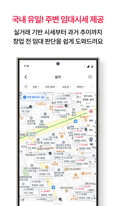 이제 매물 간 비교가 훨씬 쉬워졌습니다. 평당 임대료 기준으로 주변 시세를 한눈에 확인하고, 데이터를 바탕으로 더 합리적인 선택을 해보세요. 지도 좌측 상단의 [주변 임대시세] 버튼을 통해 과거 거래된 매물 시세까지 확인 가능합니다.