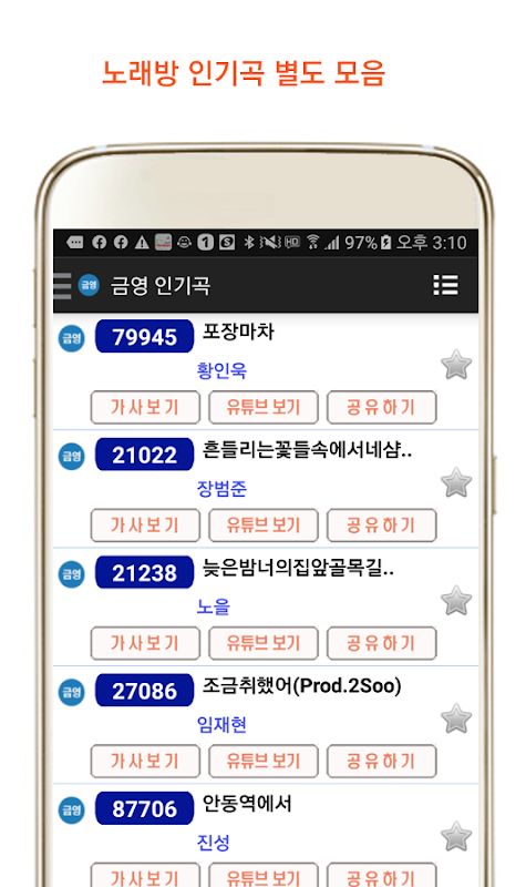 它是卡拉OK卡拉OK號碼搜索應用程序的肯定幫手搜索所有Geumyoung和Taejin(TJ)卡拉OK設備歌詞,歌曲收藏夾等