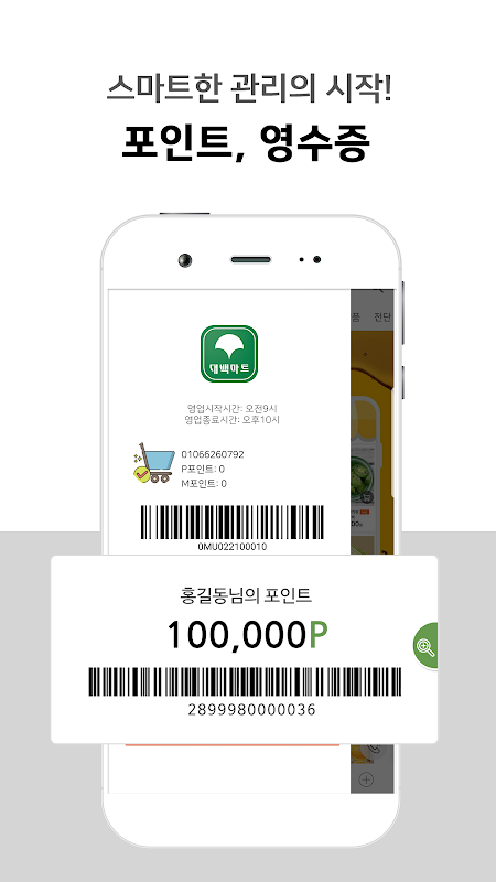 - 대백마트 동천점의 포인트 카드를 모바일로 편리하게 이용하시고, 언제 어디서든 포인트를 확인하실 수 있습니다.