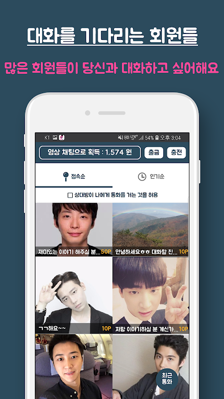 무료채팅으로 친구들과 대화하고, 대화할 때마다 얻은 포인트는 1:1비율로 환급이 가능합니다. 일반적인 채팅은 대화를 나눌때마다 정해진 현금을 얻을 수 있고, 특히 라이브영상으로 대화하면 10초마다 현금을 획득 할 수 있답니다.