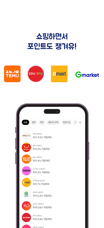 只需在Coupang、Temu、AliExpress、Gmarket、E-Mart、11th Street等各大商場購物即可累積積分。