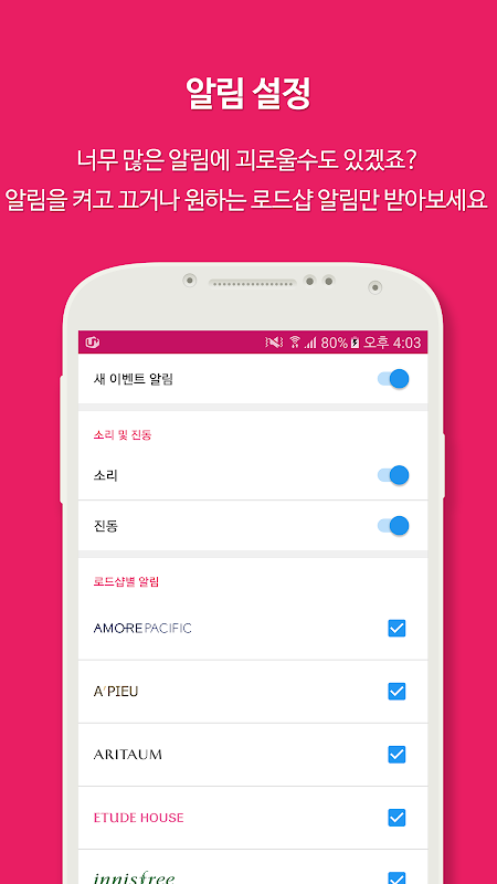 - 원하는 화장품 로드샵의 화장품 세일/이벤트정보만 받아볼수 있어요