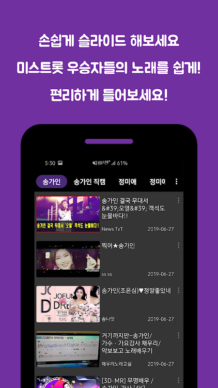 APKPure 使用簽章驗證功能,確保為您提供無病毒的 미스트롯-송가인, 정미애, 홍자, 정다경, 김나희 매일 매일 신곡 무료 APK 下載。