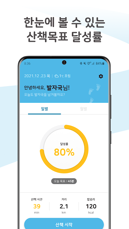 ㆍ 산책 목표와 관련된 달성률은 일별 달성률과 월별 달성률로 확인이 가능해요.