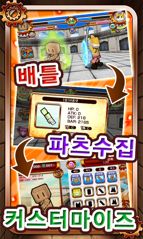 파츠는 머리. 몸, 팔, 다리, 무기 총 5종류로 자유롭게 강화 및 커스터마이즈가 가능합니다.