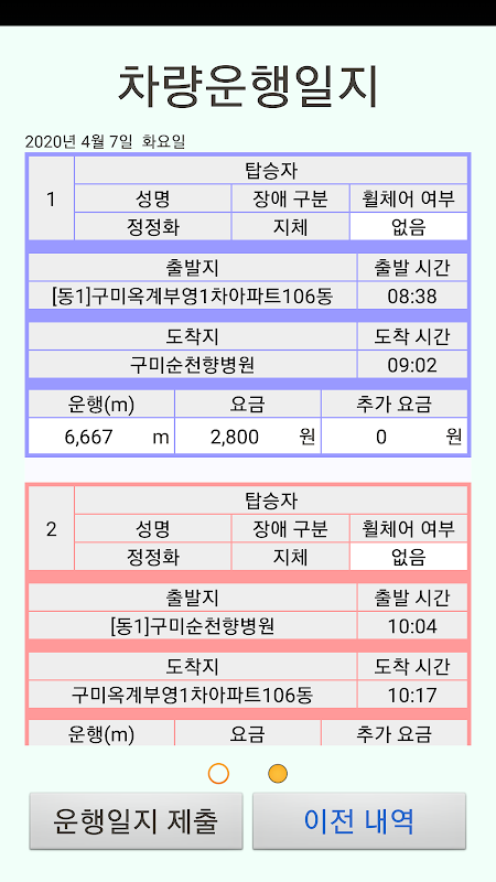 它是慶尚北道交通易受攻擊的呼叫,車輛操作日記寫作應用程序的預訂列表。
