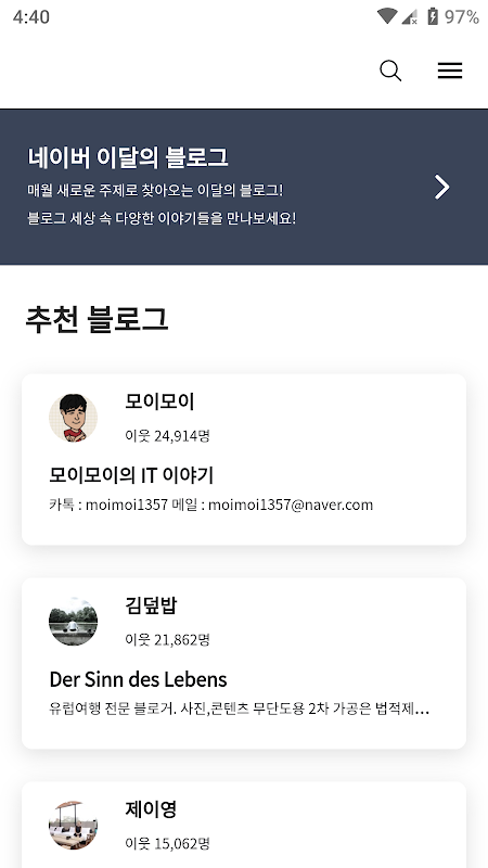 블로그모아는 1,500만 개가 넘는 블로그 시대 속에서 양질의 컨텐츠를 제공하는 블로그를 모아 카테고리별로 묶어 큐레이션 해주는 서비스입니다.