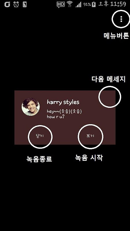 - 메인 화면에서 '보기' 버튼을 터치 할 경우 녹음이 시작 되며, '닫기' 버튼을 누를 경우 녹음이 중지 됩니다.