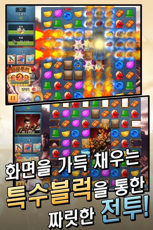 - 다양한 장수 카드와 화려한 특수 기술로 보다 숨막히는 퍼즐 대전!