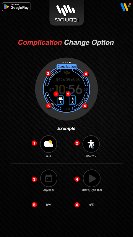 *智能手機應用程序是 Watchface 應用程序中的附加應用程序,用於解釋下載指南。它可能與智能手機應用程序的錶盤截圖和實際下載的錶盤截圖不同。 SamWatch 的大多數 Watchface 應用程序產品都包含適用於智能手機的應用程序。