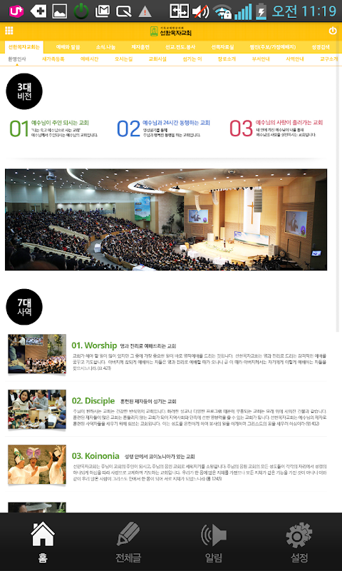 * 100% 연동형 앱 : 홈페이지에 등록된 내용, 게시물, 설교영상, 사진 등의 콘텐츠를 앱과 100% 연동하여 실시간으로 앱을 통해 확인할 수 있습니다.