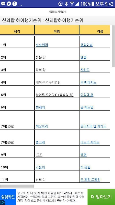 신의탑 랭킹 순위 - 하이랭커 순위정보