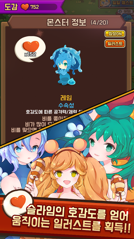 호감도를 모아 미소녀 슬라임들의 일러스트를 획득해보세요.