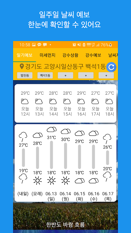 한시간 정보 및 주간 예보를 제공합니다.