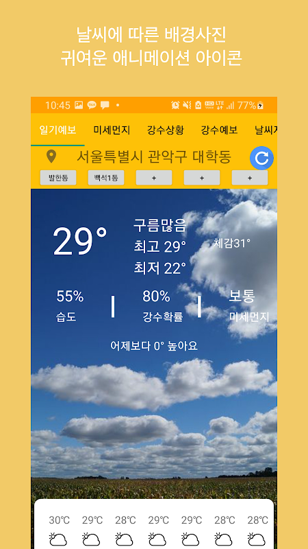 5개의 관심지역을 설정하고 편리하게 그 지역의 날씨를 확인할 수 있습니다.
