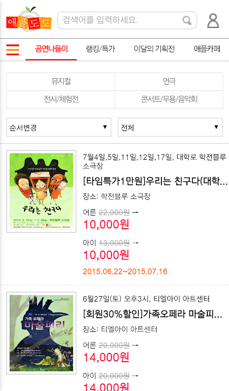 애플도도는 가족 공연나들이를 최저가로 예매 가능합니다. 어린이 공연/뮤지컬/전시/연극 정보와 공연 후기정보를 제공합니다.