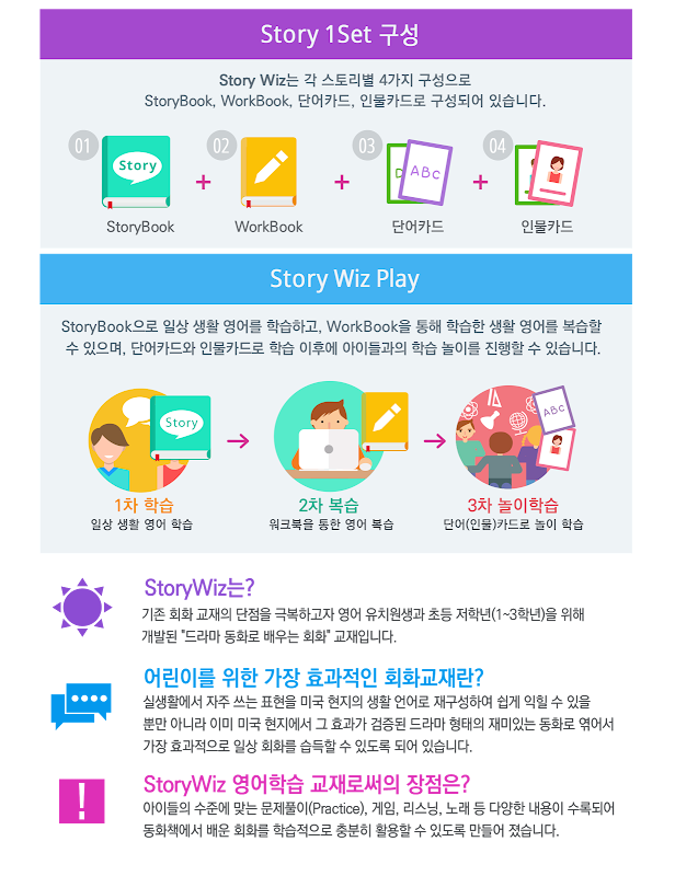 스토리위즈는 StoryBook, WorkBook, 낱말카드, 인물카드로 구성되어 있습니다.