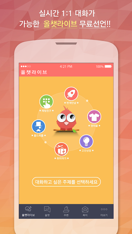 빠르고 간편하게 내 주변 사람들과 대화를 나누거나 셀프 소개팅, 데이트(만남) 약속을 잡을 수도 있으며, 마음에 드는 상대와 1:1로 채팅을 할 수 있습니다.