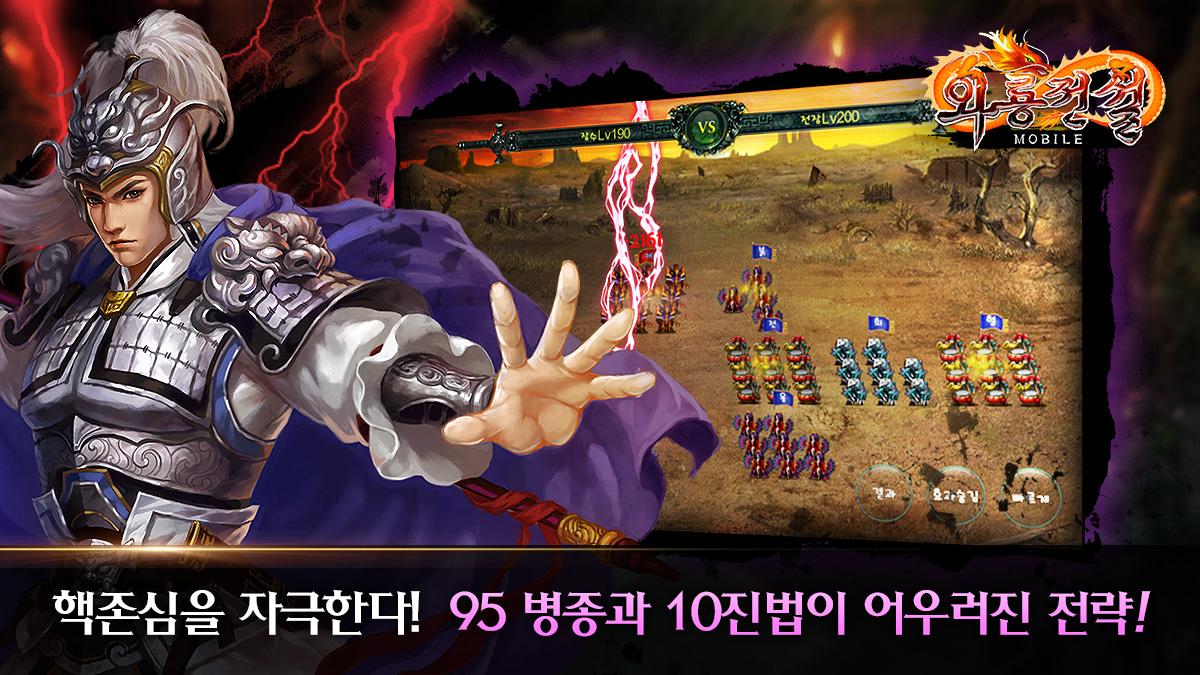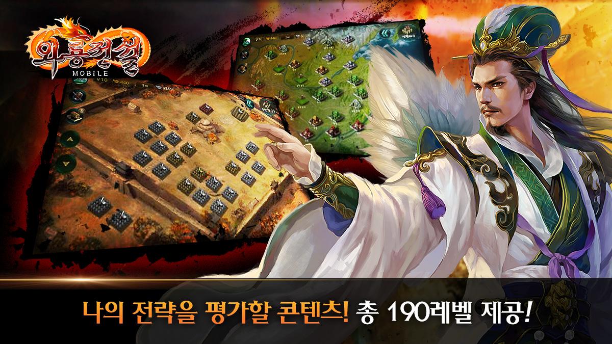 위, 촉, 오의 삼국시대를 배경으로 95개의 병종 및 10개 진법, 역사에 기초하여 설정된 450여명의 장수가 존재하는“와룡전설 모바일”은 전략RPG 중 가장 방대한 콘텐츠를 제공하며 2011년 중국 텅쉔 선정 Top10 웹게임에 랭크 되었던 와룡전설” 웹게임의 모바일 버전입니다.