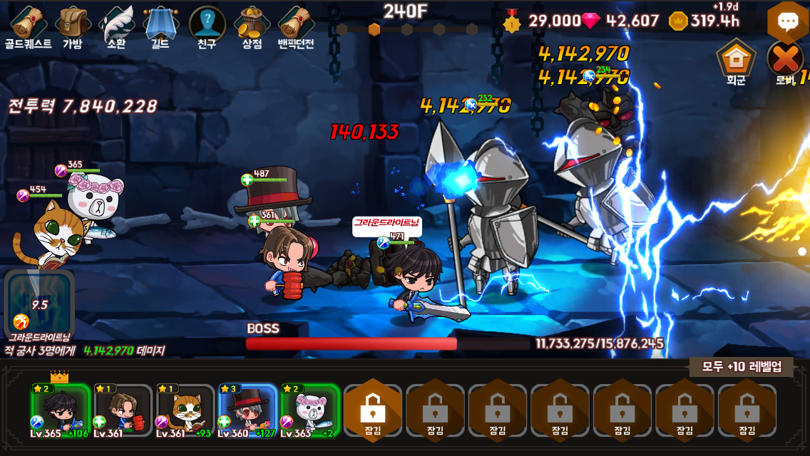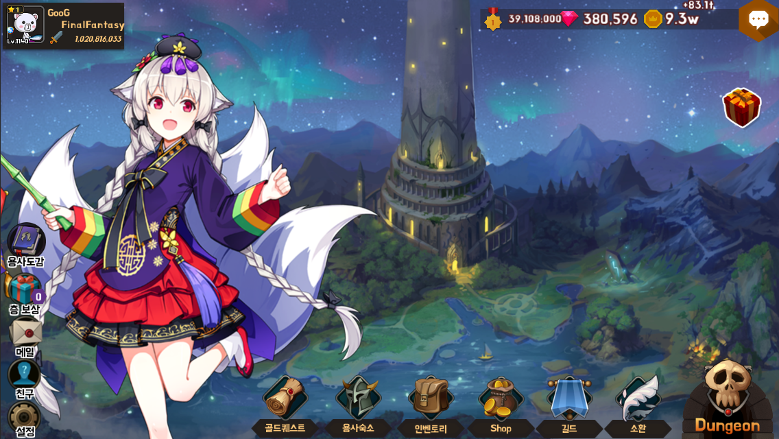 방치형 퀘스트로 골드를 모으고 장비를 얻고 케릭터를 레벨업하고 회군하여 명예를 얻어