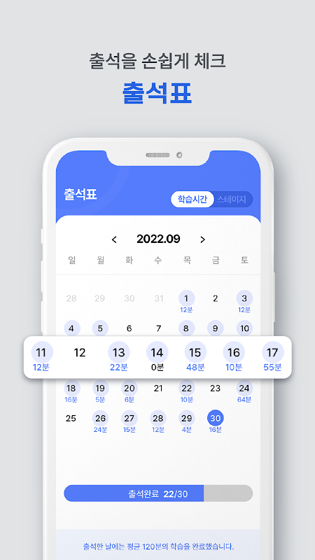 - 出勤日曆顯示一個月內完成的出席率以及每天完成的學習量(以學習數量計算)。