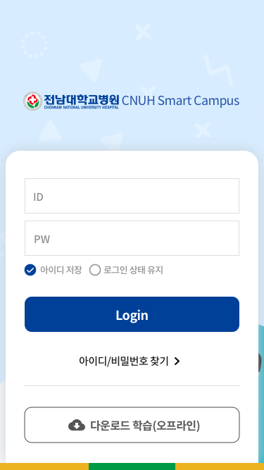 PC환경의 전남대학교병원 온라인연수원 (http://smartcnuh.hunet.co.kr/)의 아이디와 비밀번호로 로그인 가능하며, 교육과정 안내/신청, 나의 강의실 등 주요 서비스를 본 모바일 앱에서도 사용하실 수 있습니다.