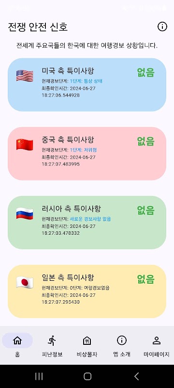戰爭安全通知應用程式是韓國用戶必備的應用程序,可以即時檢測朝鮮半島的戰爭風險並提供通知。它提供來自主要國家的全面旅行安全警告,並提供針對危險情況做好準備的詳細資訊。