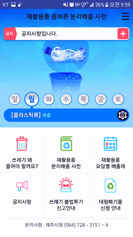 在濟州實施了回收平日單獨收集計劃。一天可回收排放的精確分離,並提供信息,以便您可以方便
