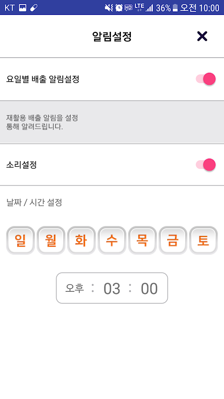 1. 재활용품 요일별 배출품목 알림 : 요일별 배출품목을 잊지 않도록 설정된 시간에 메시지로 알려주는 기능을 제공합니다.