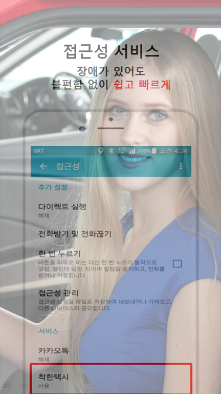 ::설정▷접근성▷서비스▷착한택시를 '사용'으로 변경하세요.
