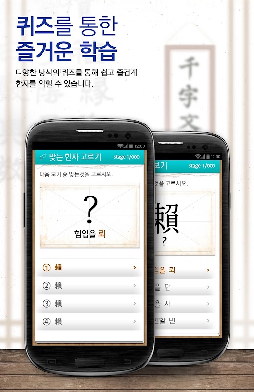 다양한 방식의 퀴즈를 통해 천자문을 공부할 수 있습니다.