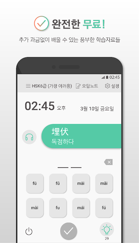 카톡확인에, 인스타, 페북 확인, 심지어 무의식적으로 한번 쓰윽 폰을 열어보지만, 폰을 열 때마다 병음퀴즈 하나씩 가볍게 풀다지면 알게모르게 공부가 정말 많이 되겠죠?