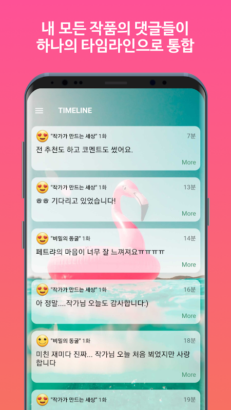 - 댓글 타임라인 : 여러 작품의 댓글을 모아서 한꺼번에 보여주기 때문에 작품이 연재 중인 플랫폼에 방문하지 않고 편리하게 독자의 피드백을 관찰