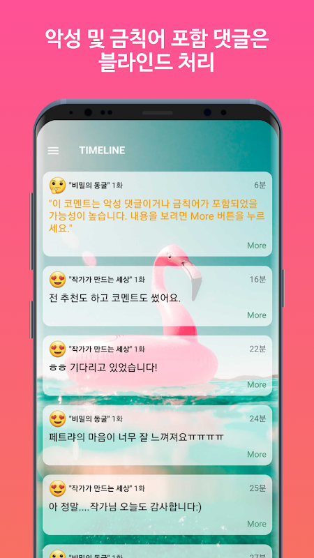 플라밍고는 작가를 위해 독자의 댓글을 실시간으로 빠르게 푸시 메시지로 전송하는 서비스입니다. 악플 가능성이 높은 댓글은 자동으로 필터링되어 푸시 메시지로 전송되지 않고 화면에서 블라인드 처리합니다.