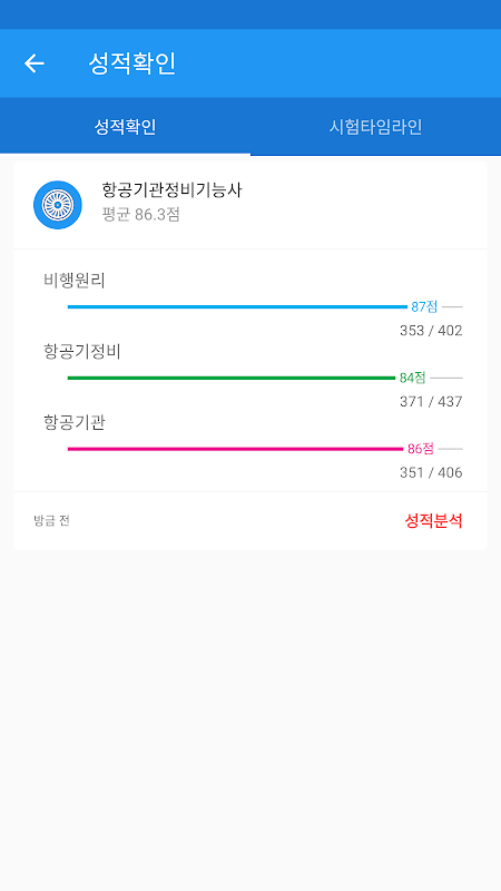 성적확인 - 각 과목별 성적 및 그동안 풀어본 기출문제와 모의고사, 문제풀기의 성적을 볼 수 있습니다.
