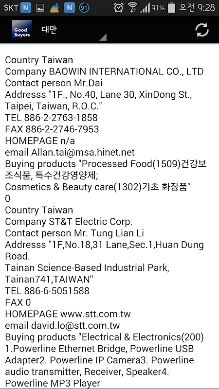이메일 정보나 담당자 정보가 변경된 경우, 반드시 전화를 이용하여 새로운 담당자 이름 및 이메일 주소 확인하시기 바랍니다. 이 앱에서는 국내외 무역과 관련된 분들이 서로 활동하실 수 있도록 페이스북 팬페이지로 연결하도록 유도하였으며, 더 많은 양의 해외 수입자 리스트를 살펴보시도록 개발자의 다른 앱도 소개가 병행되었습니다.