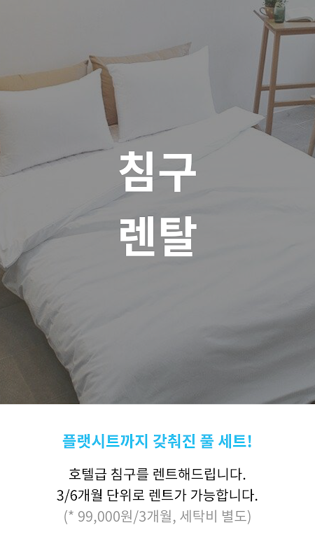 · 침구 렌탈 : 호텔급 침구를 렌트해드립니다. 3/6개울 단위로 렌트가 가능합니다.