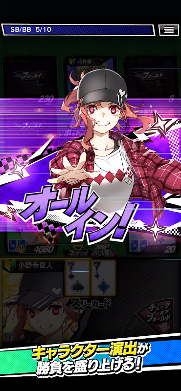 ・m HOLD’EMでは、既存に存在するテキサスホールデムのゲームアプリのイメージを払拭するスタイリッシュなデザインと、有名イラストレーターがデザイン&有名声優が演じる個性豊かなアバター達と共にゲームを楽しむことができます。また、ゲーム中に状況に応じたキャラクターごとに用意されているスタンプを使って、プレイヤー同士の交流を取りながらテキサスホールデムを堪能できます