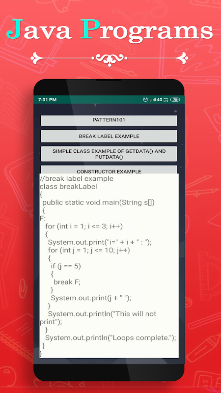 To rock java programming you must develop your skill with example or programs. Java Examples App app helps you to refer a great collection java programs on the go and Helps you improve Logical thinking of various problems related to Programming. Java Examples Application give source code and output for various Java Programs or examples.