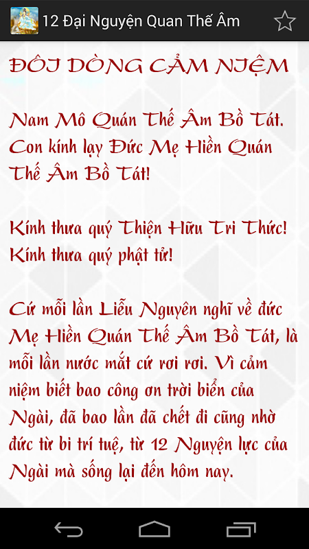 ỨNG DỤNG "12 Đại Nguyện Quán Thế Âm" LÀ ỨNG DỤNG HOÀN TOÀN MIỄN PHÍ, KHÔNG YÊU CẦU KICK HOẠT BẰNG SMS, KHÔNG TỰ GỞI SMS, KHÔNG THU THẬP THÔNG TIN CÁ NHÂN CỦA NGƯỜI DÙNG. CÁC BẠN CÓ THỂ KIỂM TRA SMS PERMISSION TRƯỚC KHI CÀI ĐẶT.