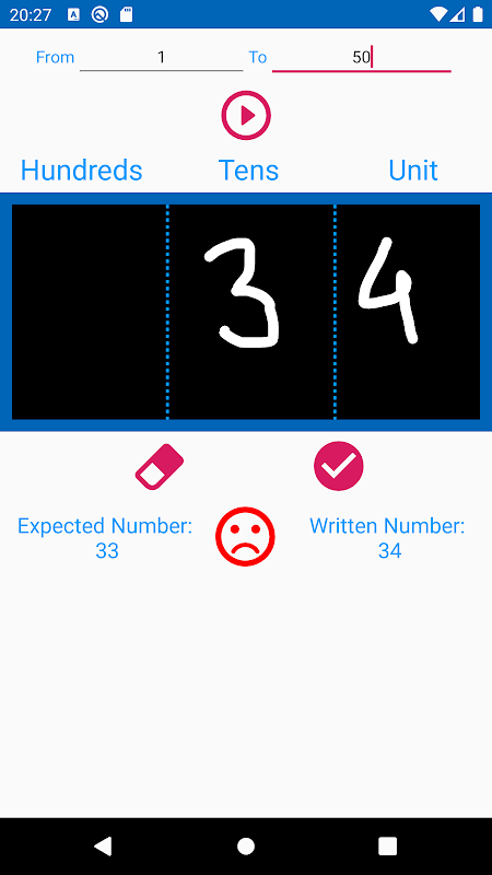 Numprofi最適合幼兒園和一年級孩子練習從1到999的數字書寫。應用程序中的黑板分為“一”,“十”和“一百”個位置,以更好地理解這一概念。 App的序號寫屏,其中必須從1開始按順序寫,App每10個數字都會給出一個糖果,並且還會為較大的數字頒發獎杯,例如50、100。應用程序的“聽與寫”屏幕在按“播放”按鈕時說出一個數字,並且一個人必須寫下相同的數字才能獲得快樂的笑臉。該應用程序當前支持英語和德語。