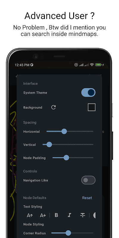 可以修改默認選項,包括連接寬度、這些節點之間的距離和節點內部的填充以及整個思維導圖的背景,所有那些吸引高級用戶的功能。