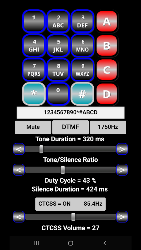 該應用程式將為您提供 16 音 DTMF(雙音多頻)鍵盤以及與歐洲中繼器一起使用的 1750Hz 音訊突發按鈕,並能夠產生自訂 DTMF 序列以及設定持續時間和音調/靜音比。此外,還包含 52 種 CTCSS 音調。