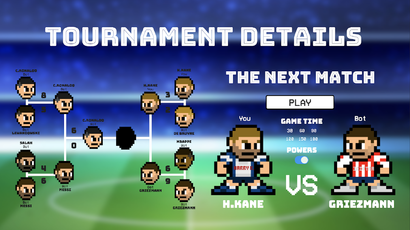 選擇眾多足球或足球明星之一併開始比賽。嘗試在這款像素足球遊戲中盡可能多地進球,不要丟一球。
